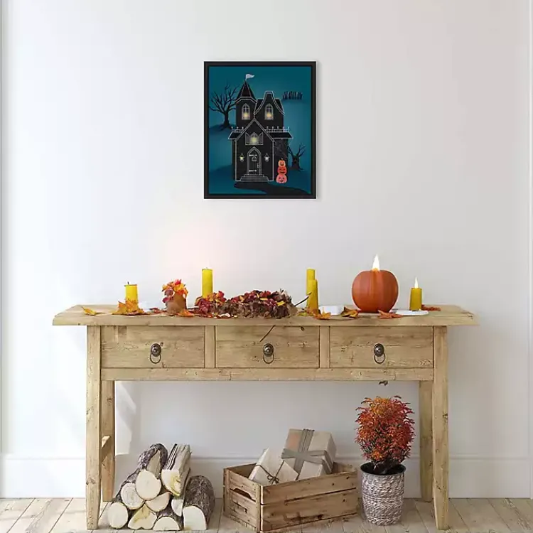 Create an eerie atmosphere with this Black Haunted House Framed Canvas Print. Featuring a gothic-style house complete with jack-o-lanterns, it will make your home a little spookier this Halloween!