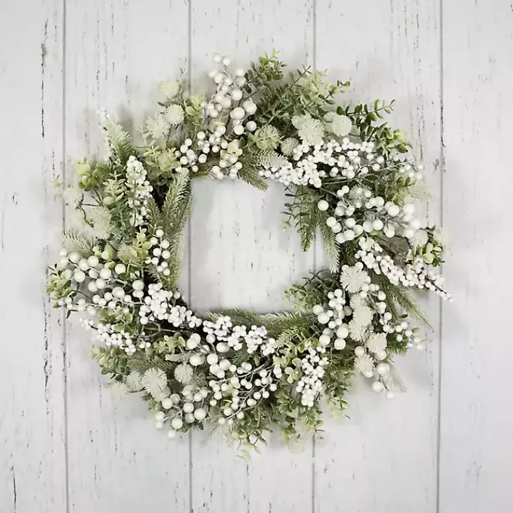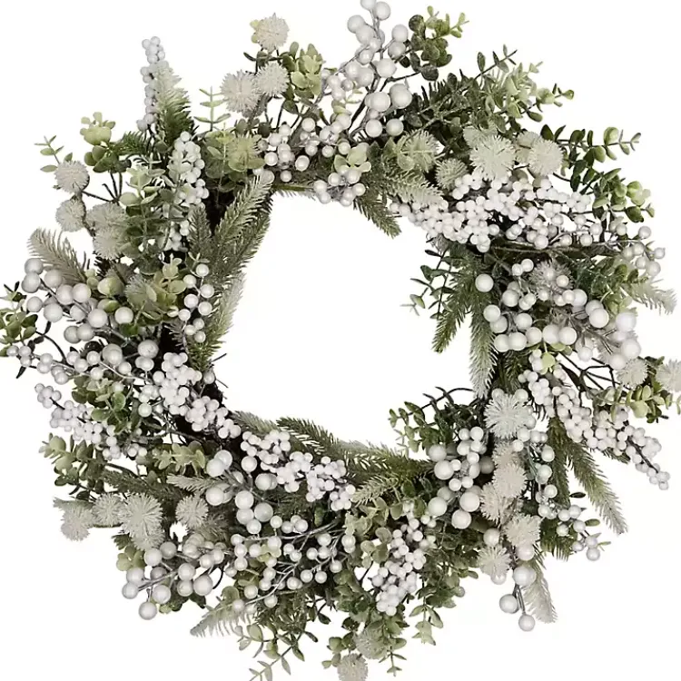 This Flocked Eucalyptus and Pine Christmas Wreath will transform your home into a winter wonderland! This full wreath features white berries and thistle embellished with glitter for a magical, festive look!