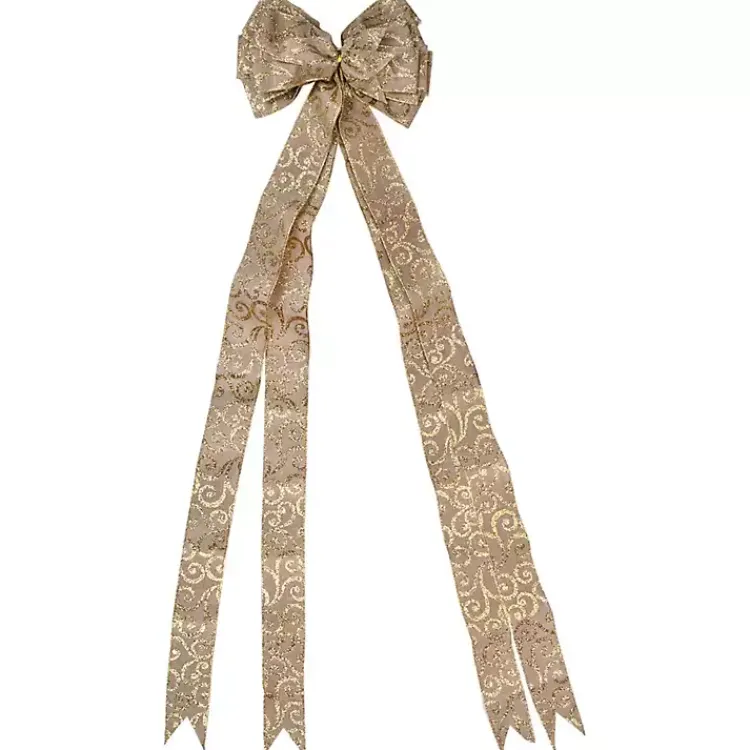 Wrap your Christmas tree up with a bow! Featuring beautiful glitter detailing, this Gold Scroll Burlap Bow Tree Topper will make your tree shine all season long!
