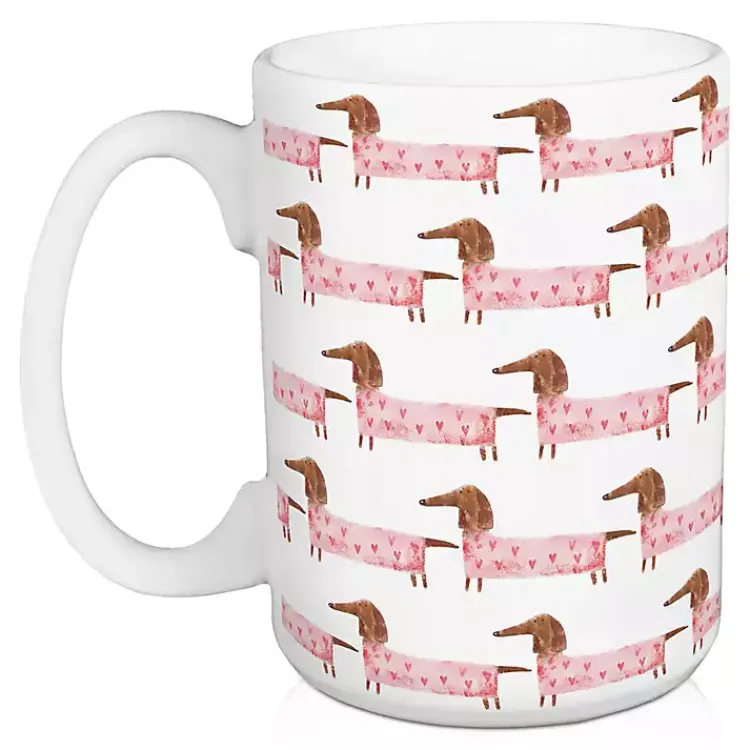 - First mug features a pattern of dachshunds wearing heart sweaters