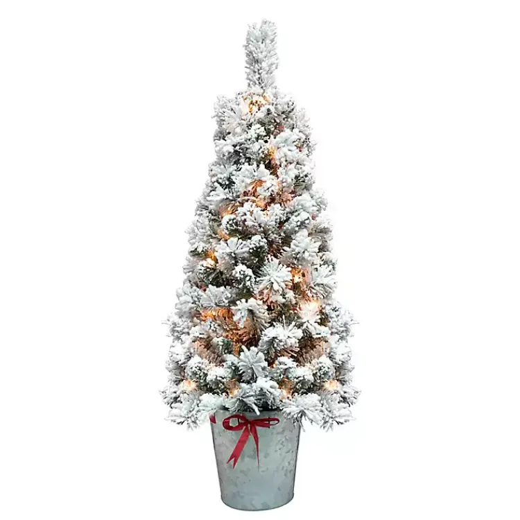 Add a dusting of winter charm to your Christmas decor with this 4 ft. Pre-Lit Flocked Pine Tree in Metal Pot! Its flocked branches will add seasonal style to any space.