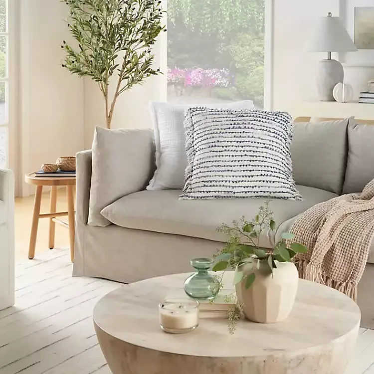 Add a fun pop of texture and contrast with our Navy Handstitched Stripes Throw Pillow! The mix of hues and stitching will bring chic style and coastal flair to your space!