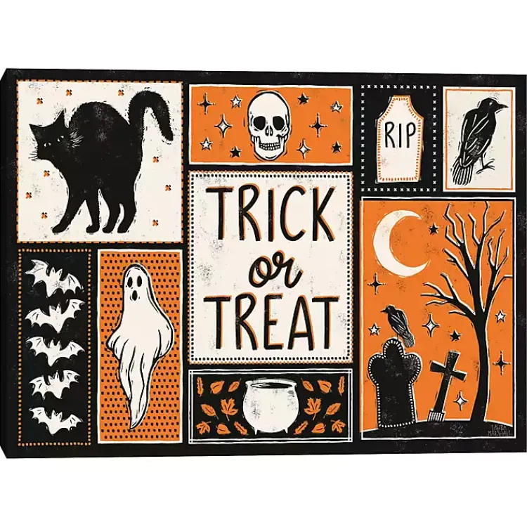 Complete with a black cat, a ghost, and more, this Trick or Treat Collage Canvas Art Print captures the spirit of Halloween. It will bring a fun fright to your home this spooky season!