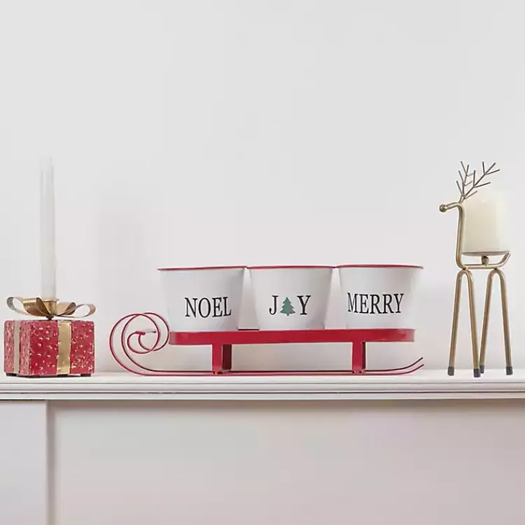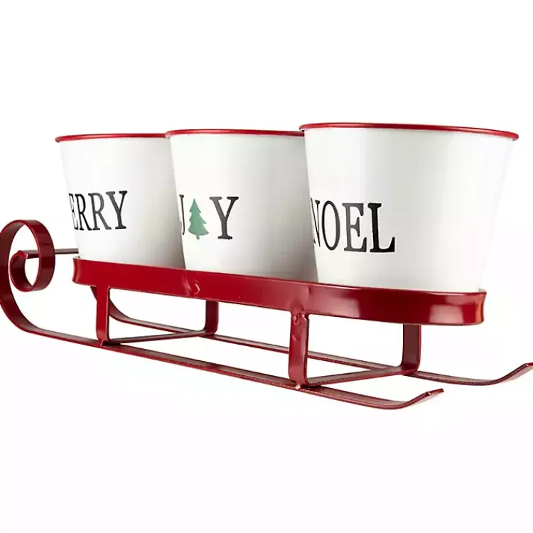 - Buckets feature the words “Noel”, “Joy”, and “Merry”