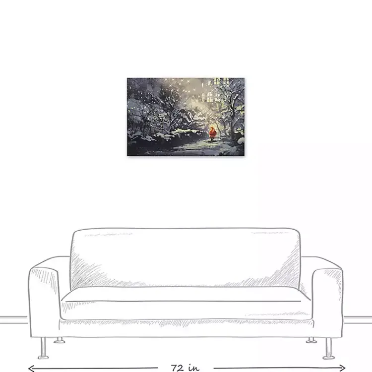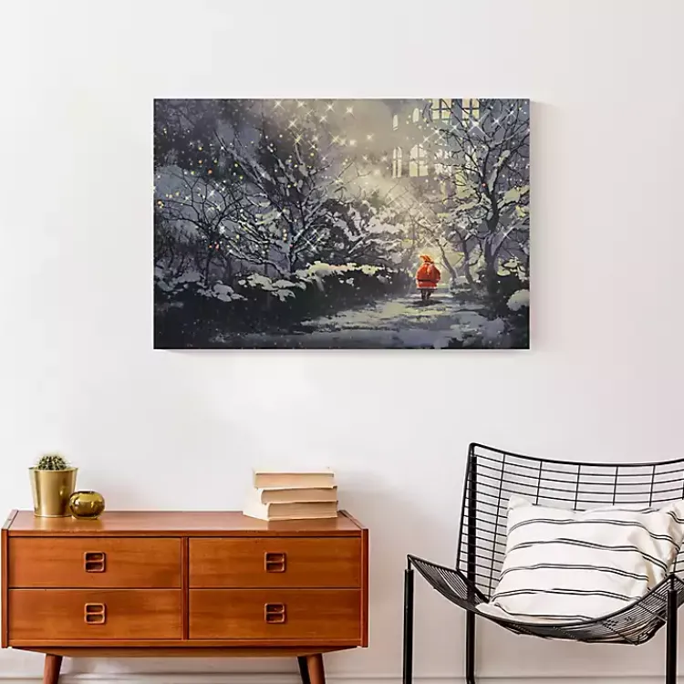 Immerse yourself in the enchanting winter scene of this Santa Walking in the Snow Canvas Art Print. A beautiful glow shines on St. Nick himself, capturing the magical feel of Christmas.