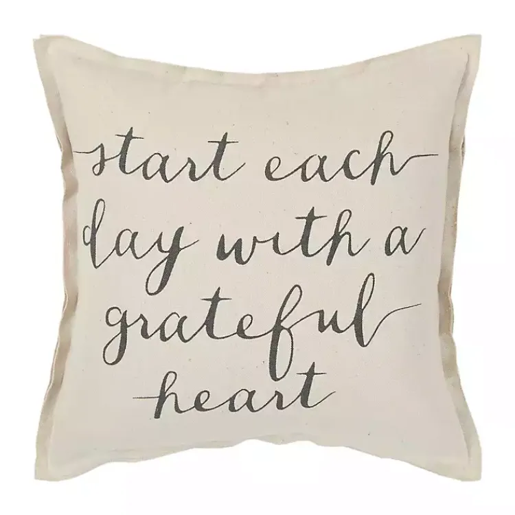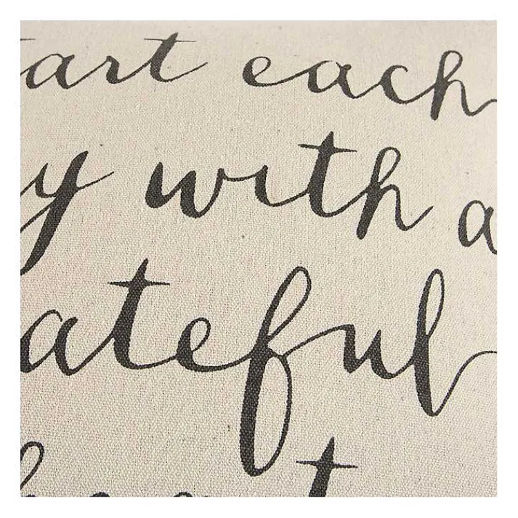- Features the phrase “start each day with a grateful heart” in rustic black print