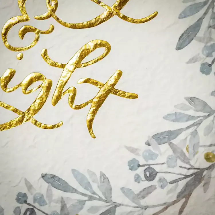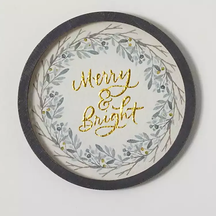 - Features a wreath pattern with the phrase “merry and bright” in gold lettering