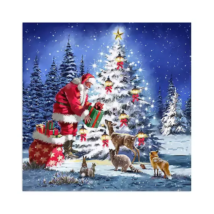 - Features a Christmas scene with Santa giving gifts to woodland creatures
