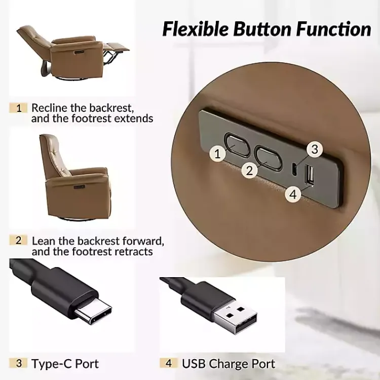 This Val Brown Faux Leather Swivel Power Recliner has your back, literally! This recliner is perfect for laying back and relaxing, plus it has the ability to charge your devices. Its stylish design will elevate the look of any room in your home!