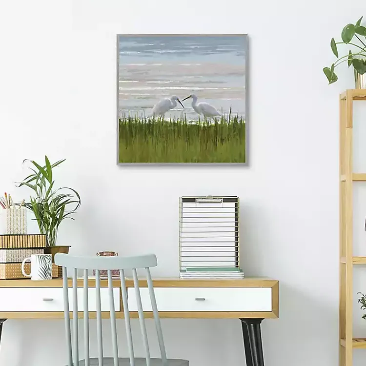 Spread love and peace into your home with the Egret Meeting Framed Canvas Art Print. This lovely canvas will melt your heart with its serene glimpse of coastal wildlife!
