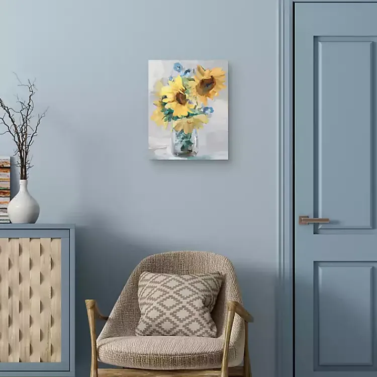 A simple arrangement of sunflowers in a mason jar sits center stage in our Petite Fleurs Sunflower II Canvas Art Print! You’ll love having this joyous print in your home.