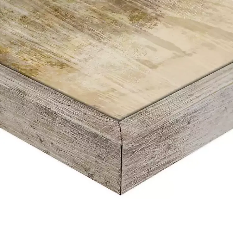 A quaint cabin is surrounded by golden grass and a still lake in this Spring Serenity Framed Canvas Art Print. This rural scene will make you want explore nature and get some fresh air.