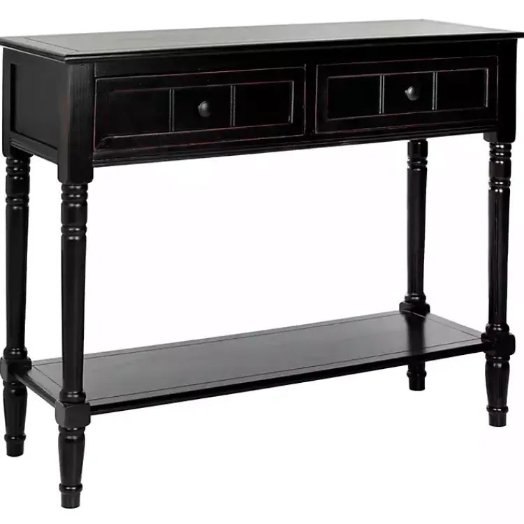 Create a charming entryway display with this Distressed Black Wood 2-Drawer Console Table. Featuring classic turned legs, it’s sure to incorporate a timeless element into your space.