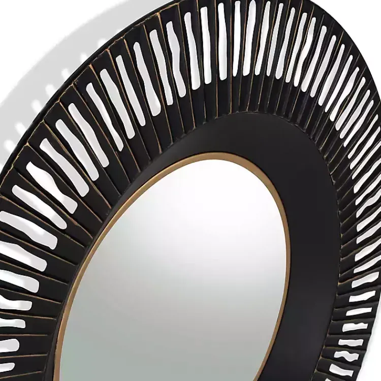 This Round Cantara Black Metal Wall Mirror offers an effortless way to enhance any room. Featuring open cut outs and gold details, it fits easily with any decor from industrial to contemporary!