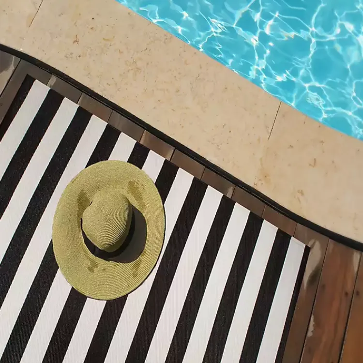 Give your backyard hangout a bold, retro look with this Black and White Rugby Stripe Outdoor Area Rug. Durable yet comfortable underfoot, it’s perfect for year round use!