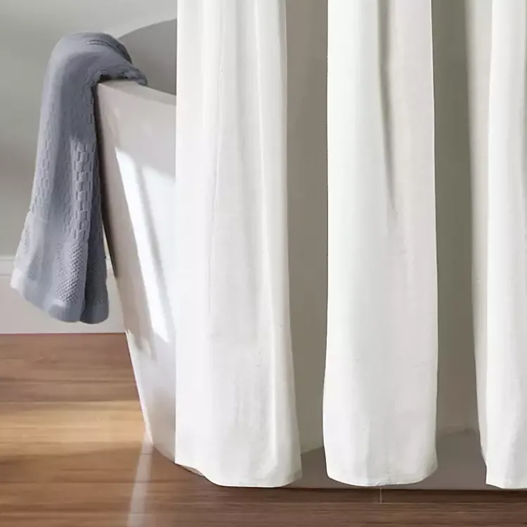 Add the elegance of linen to your bathroom with this chic Navy and White Button Accent Linen Shower Curtain. The color blocking, buttons, and pleating all work so well together!