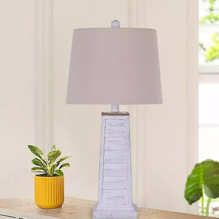 Light up your traditional farmhouse space with the set of White Louvered Shutter Table Lamps! The oatmeal linen shades, shutter bases, and distressed finish create a striking design.