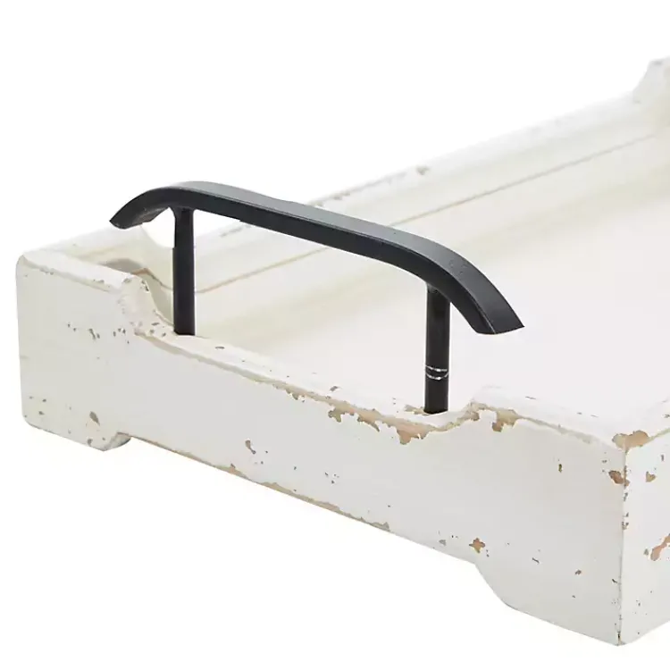 Complete your cottage with these Distressed Ivory Wood Trays. Each of the two trays are chic with their carved edges, metal handles, and antique white finish.