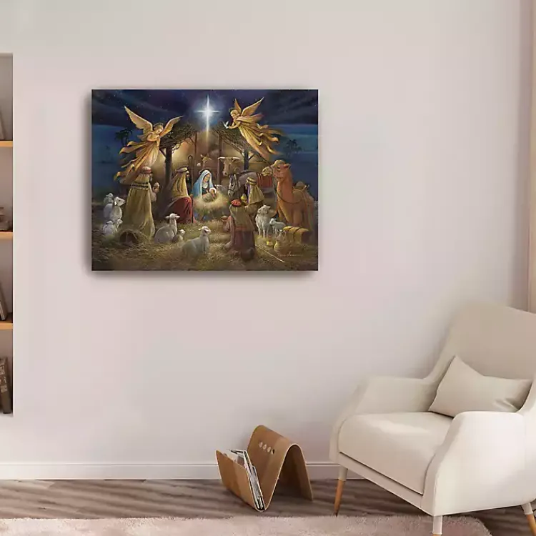 Witness divinity with this Nativity Scene Giclee Canvas Art Print. This Giclee print is full of rich hues that portray the holy moment Jesus was born.
