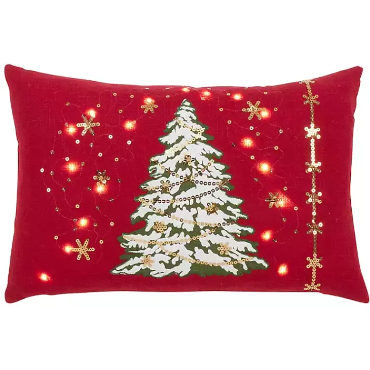 Illuminate your space with bright lights with this Red Christmas Tree LED Accent Pillow. The Christmas tree with gold sequins is surrounded by flashing lights.