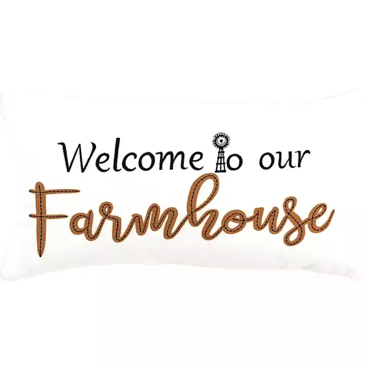 - Features the phrase “Welcome to our Farmhouse” in embroidered letters