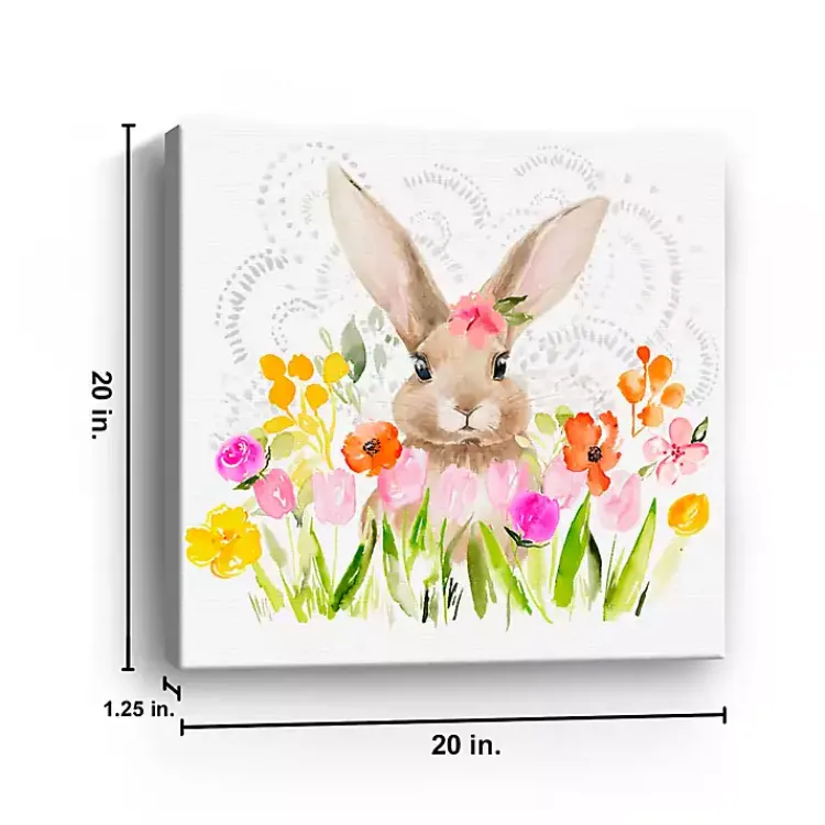 An adorable bunny peeks from a flourishing garden in this April Flowers and Happy Bunny Canvas Art Print. Perfect for the springtime, it adds a punchy pop of color to any space!