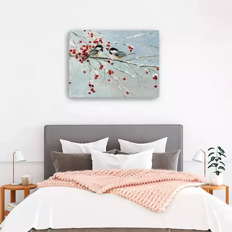 Featuring a bird duo perched on snowy branches, this Chickadees in Winter Canvas Art Print will bring an adorable, natural touch to your holiday decor! Pops of red berries will look great on any wall.