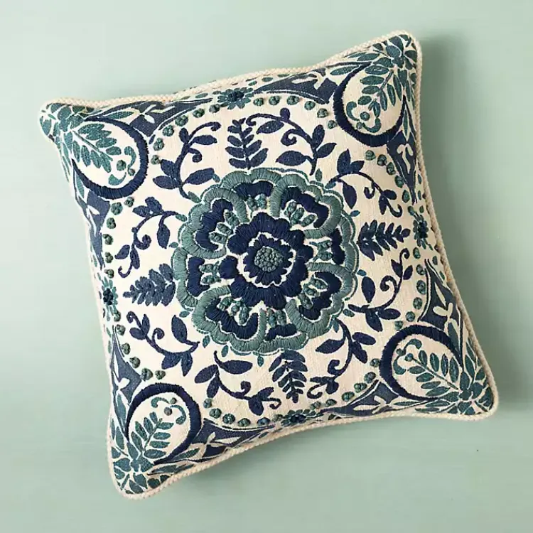Our Blue Embroidered Claudia Pillow blends rich textures and intricate motifs to create a captivating medallion design. While the front makes a showstopping statement, the reverse features a chic quatrefoil pattern for a more understated look.