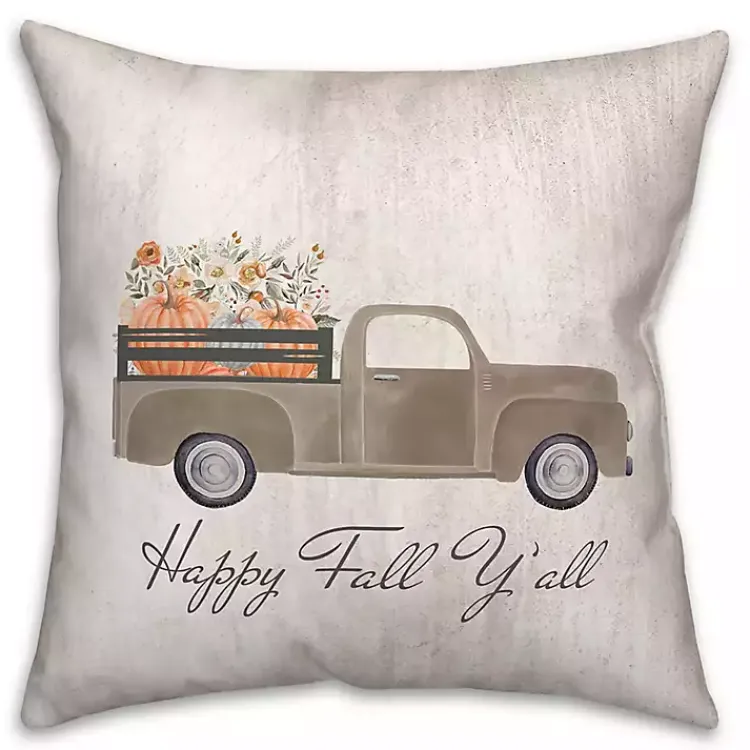 Fall in love with this Happy Fall Y’all Pumpkin Truck Pillow. You’ll love the vintage truck carrying pumpkins and fall flowers on a distressed white pillow.