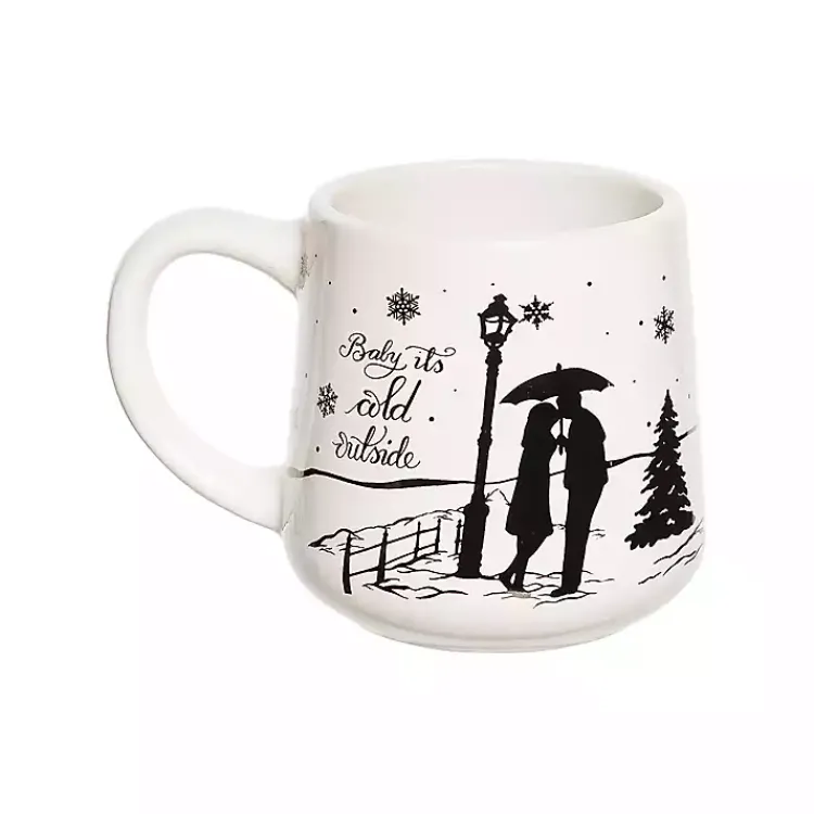 - Mug A features a silhouette of two (2) people and the text, “baby it’s cold outside”