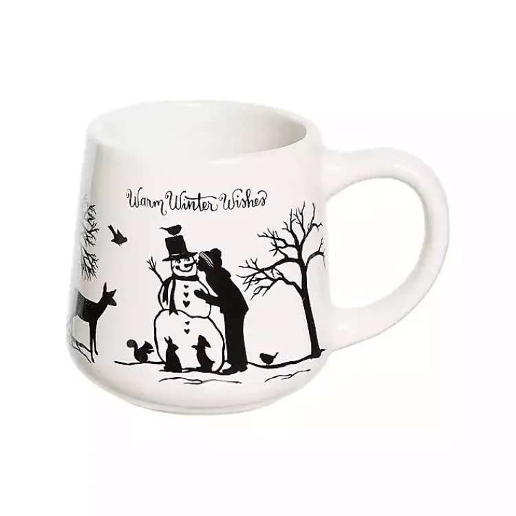 - Mug B features a snowman, person, and woodland animals with the text, “Warm Winter Wishes”