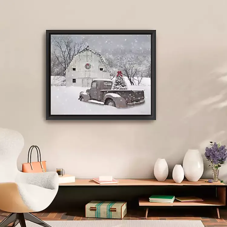 - Features a white, snow-covered barn and a vintage truck with a pine tree in the bed