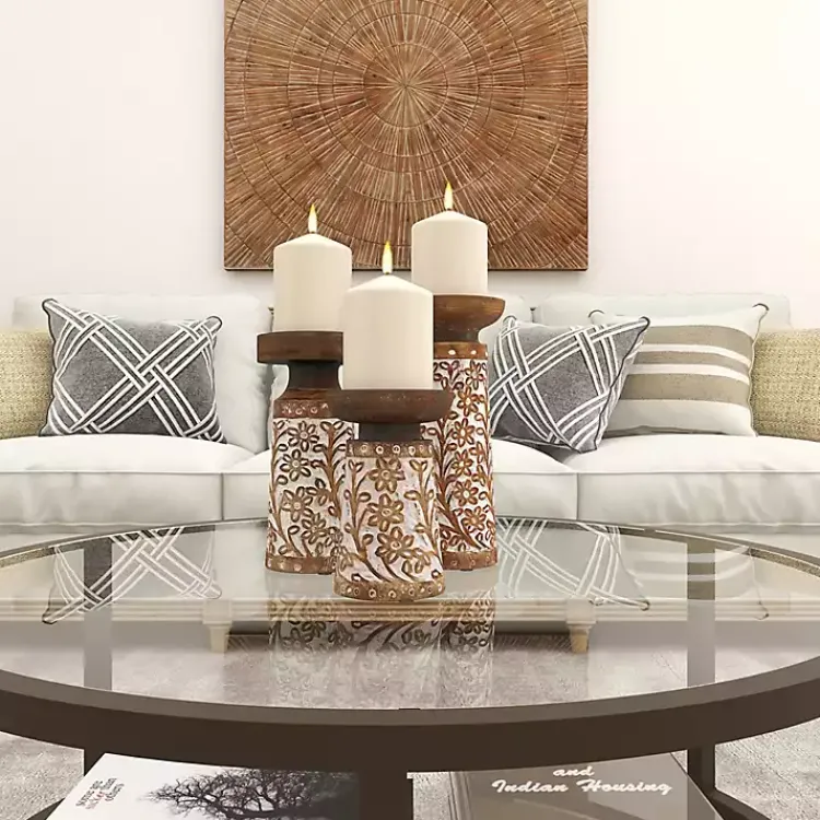 Light up your boho chic decor with the help of these Whitewash Floral Mango Candlesticks! You’ll love the carved embellishments and the natural distressed wood finish.