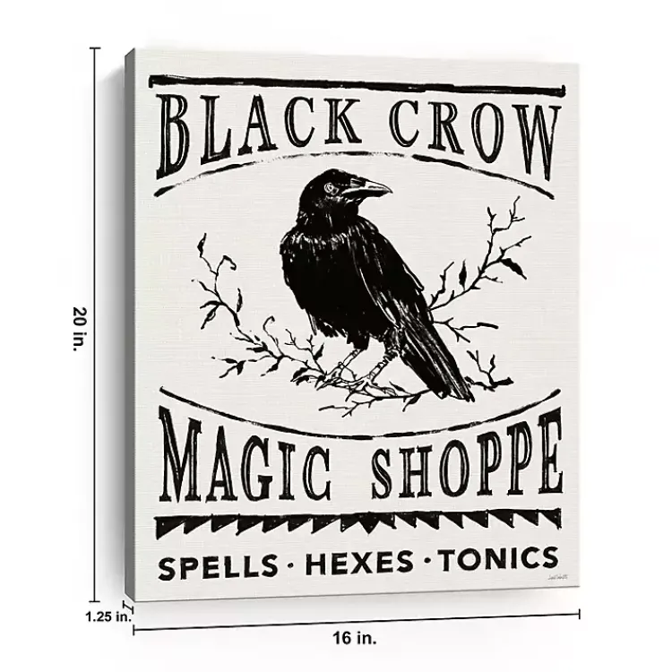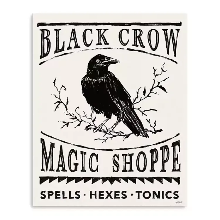 - Features the phrases “Black Crow Magic Shoppe” and “Spells-Hexes-Tonics”