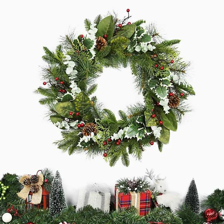 - Features a mix of evergreen branches, pinecones, eucalyptus, leaves, and berries