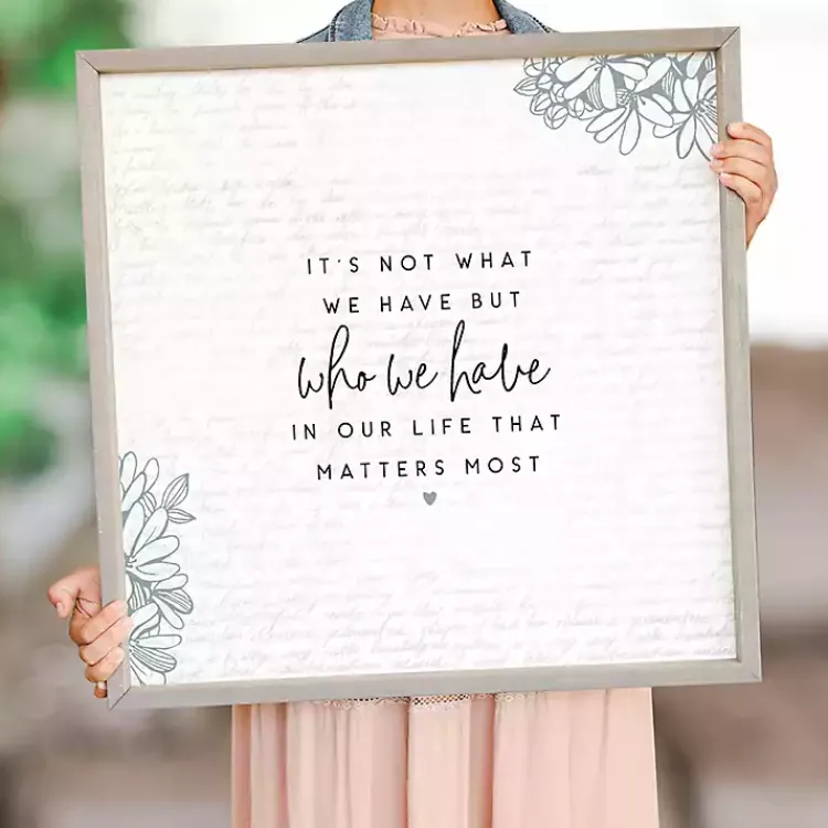 - Reads “It’s not what we have but who we have in our life that matters most” with floral details