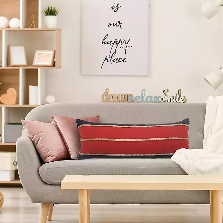 This Red & Navy Nautical Rope Lumbar Pillow features a blue and red striped design and textured jute braiding. It’s a wonderful accent for the nautical or Americana home!