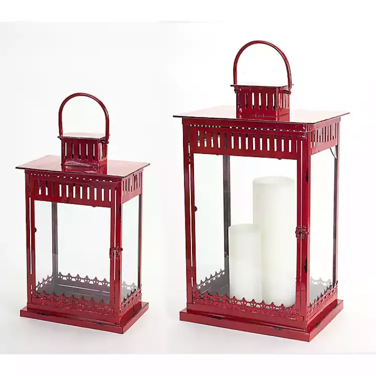Elevate your holiday décor with these Rustic Red Ornate Metal Lanterns! Their rustic finish and elegant design gives these lanterns an antique look. Style them with candles or festive décor to make them pop!
