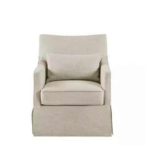Blending traditional farmhouse charm with modern versatility, this Beige Skirted Swivel Martha Stewart Accent Chair features beige woven upholstery and a 360 degree hidden swivel base. Designed for comfort with plush cushions, it’s perfect for any living room, bedroom, home office, or nursery!