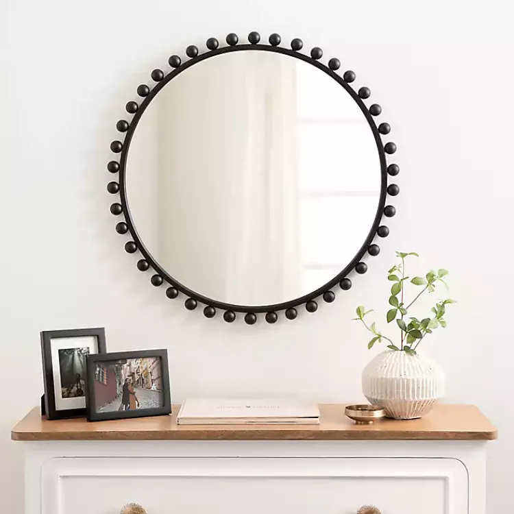 Make any room feel bigger and brighter with this Round Black Beaded Metal Wall Mirror. You’ll love the refreshing style and dimension it brings to your home!