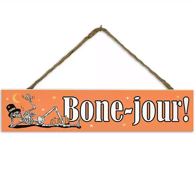 Give guests a cute and creepy welcome with this Bone-Jour Skeleton Hanging Wall Plaque. Its cheeky design is sure to add an element of fun to your Halloween decor!
