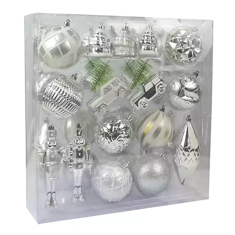 The Silver & White Mix 36-pc. Christmas Ornament Set includes a festive assortment of shaped, finial, and ball ornaments in varying finishes. Deck the halls or embellish a Christmas tree with these gorgeous, shatterproof ornaments!