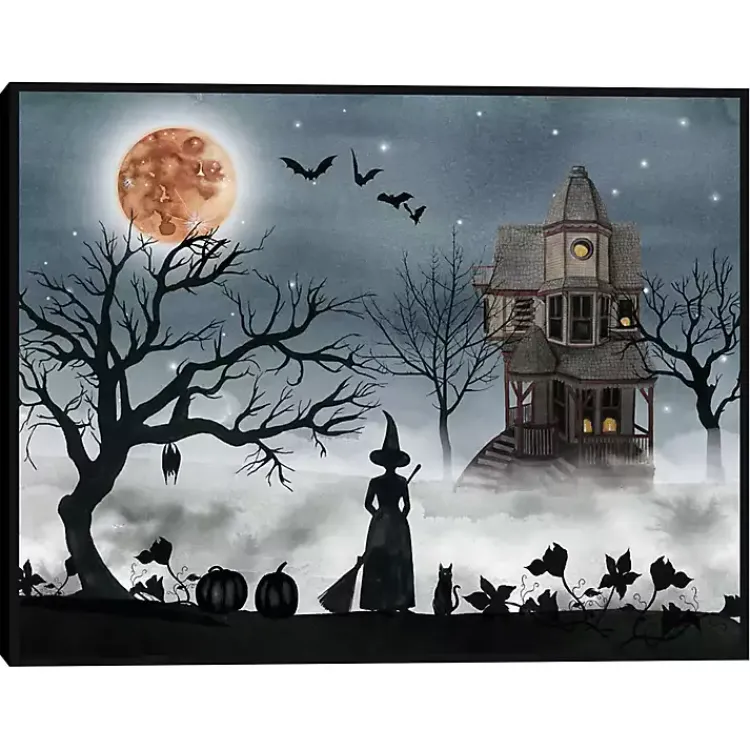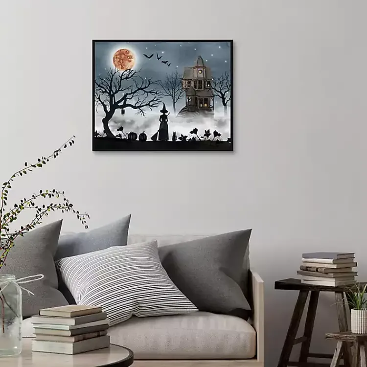 Let this Spooky Harvest Moon Framed Canvas Art Print haunt your home this Halloween. Featuring a witch on a foggy night, it brings a creepy ambiance to any space!