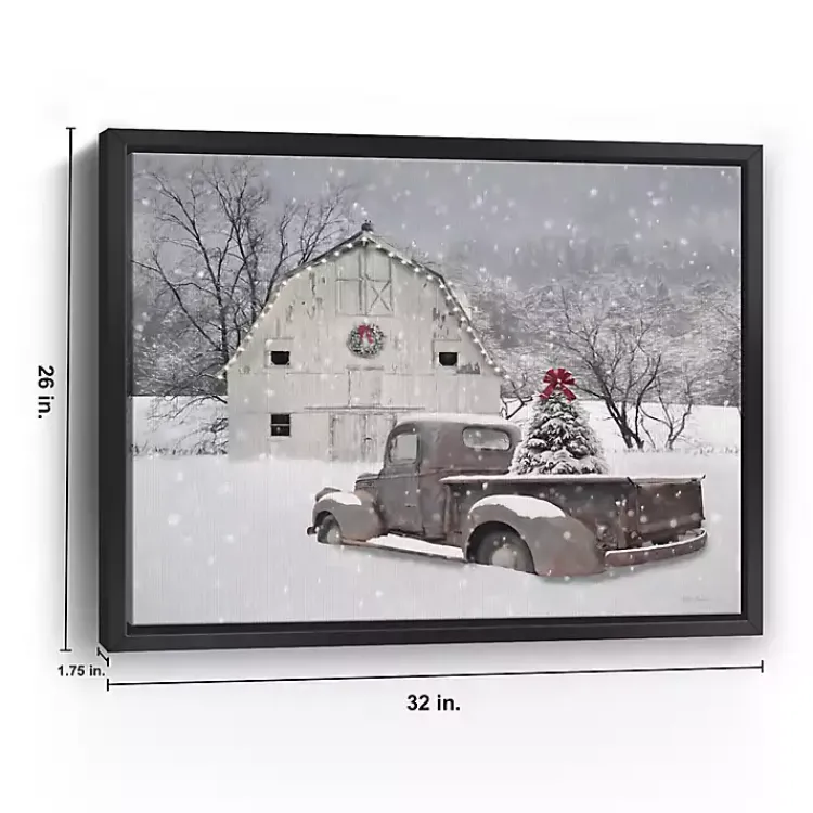 - Features a white, snow-covered barn and a vintage truck with a pine tree in the bed