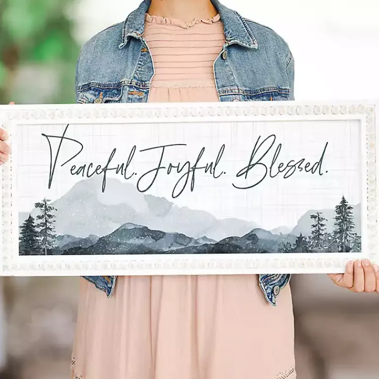 Decorate your home for the holidays with this Peaceful Joyful Blessed Beaded Frame Wall Plaque. The snowy landscape will bring a cozy, winter charm to your space!