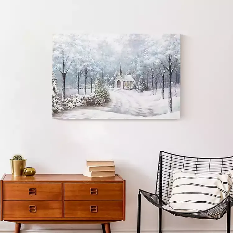 Our Chapel in a Winter Forest Canvas Art Print will have you feeling like you’re walking in a winter wonderland! This peaceful print will give your home a serene look and feel!
