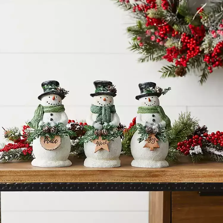 - Snowmen hold signs that read “Peace” “Joy” and “Noel”